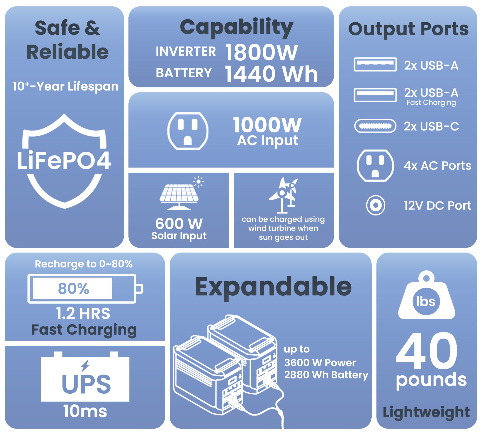 Reliable 1800W performance with expandable capacity, multi-charging options, and dependable backup power for home, emergency, and outdoor use.