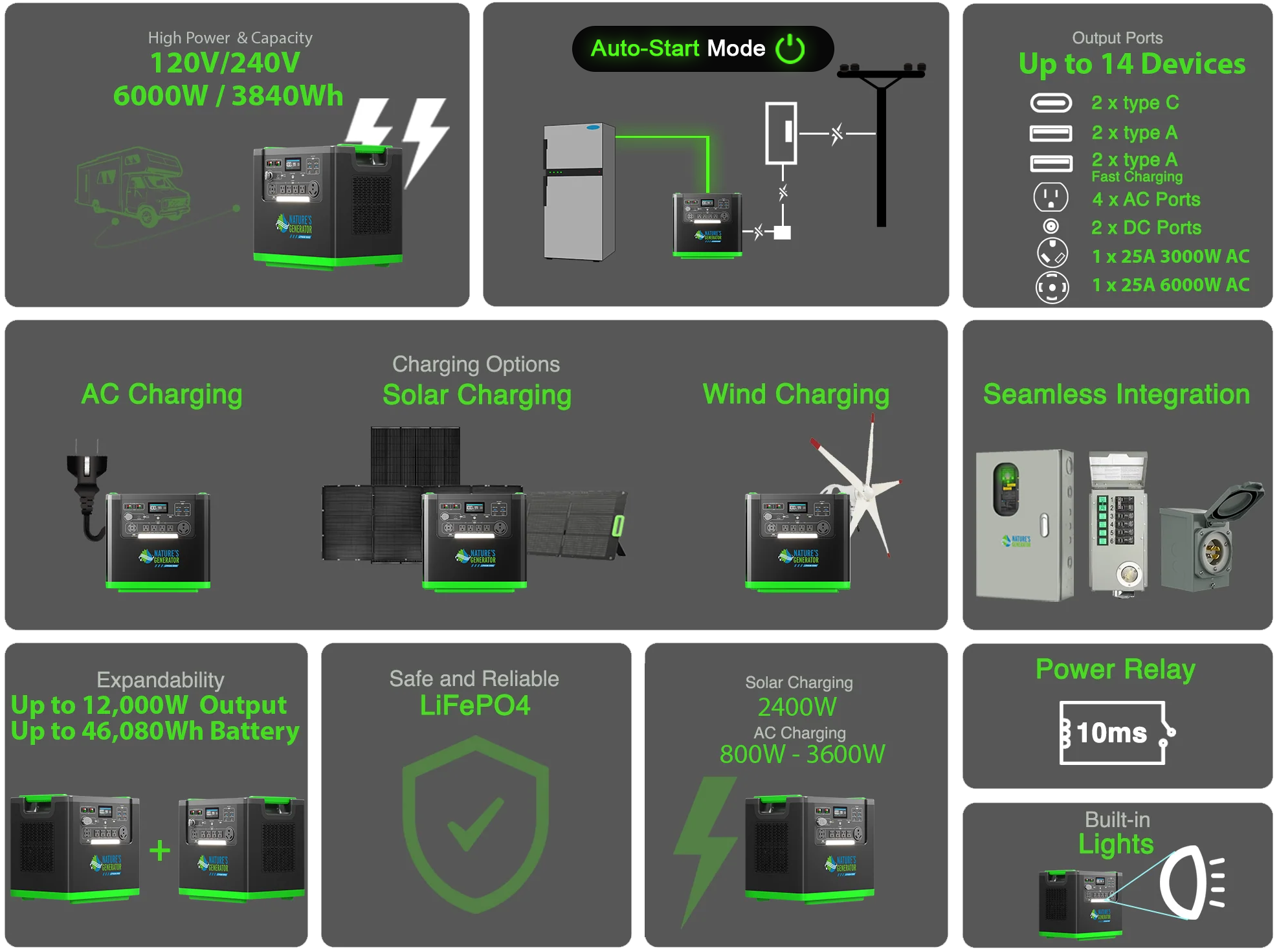 Robust 6,000 W Whole‑Home Power: Delivers up to 120 V/240 V and 6000W continuous output with  pure sine wave power, an ideal whole house generator for home backup, off-grid use, RVs, or as an uninterrupted power supply.